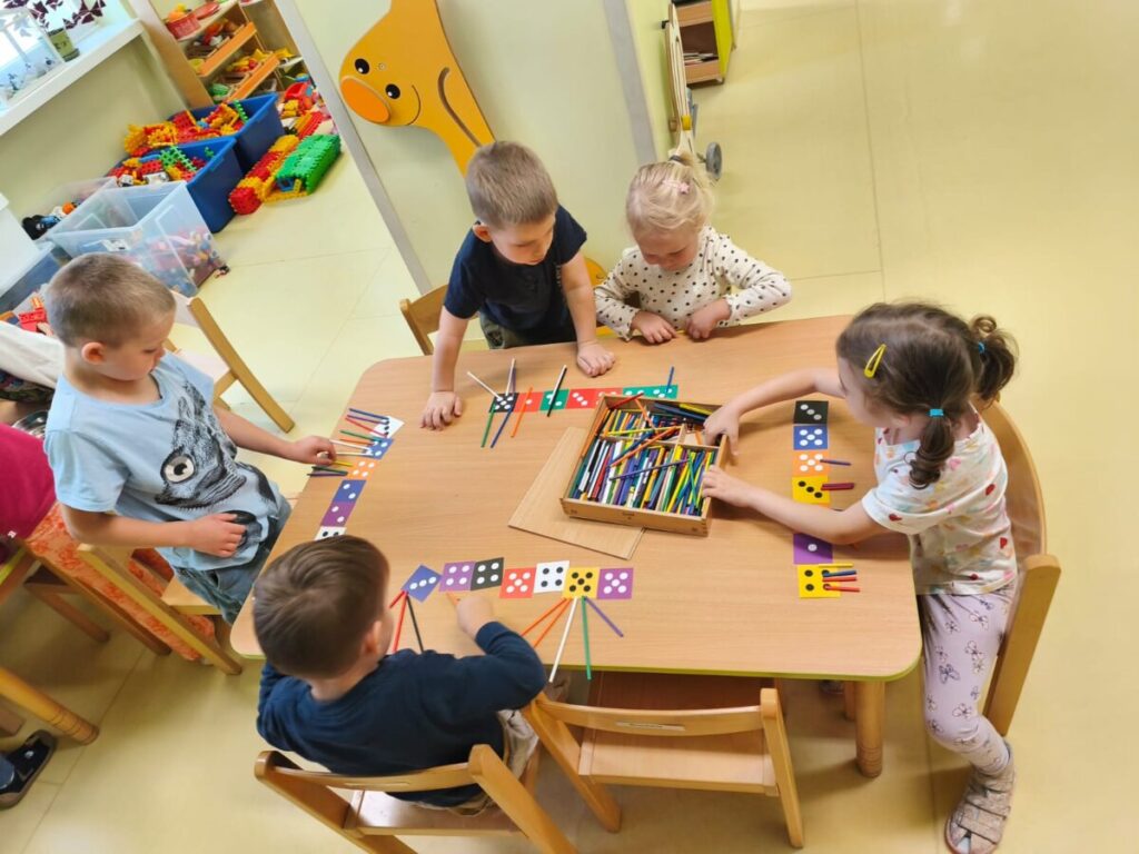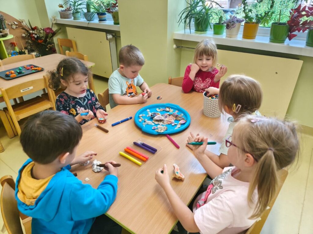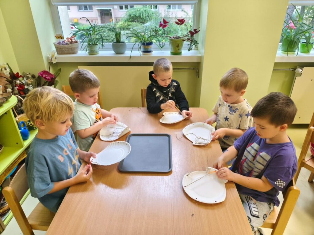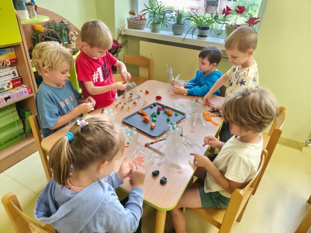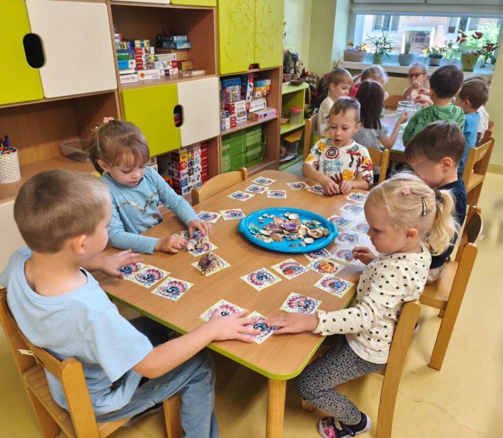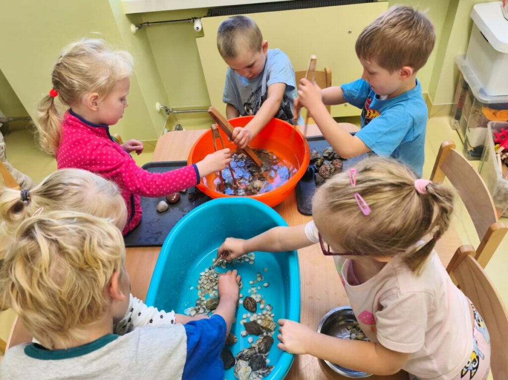 Dzieci w zespołach zabawowo-zadaniowych wykonują różne aktywności, często wykorzystując dary ucząc się systematyczności, odpowiedzialności i współpracy. Takim przykładem są zajęcia w których dzieci układały z darów Froebla wspomnienia z wakacji. Następnie wyławiały z wody muszelki i kamienie za pomocą szczypiec, co rozwija motorykę małą i koordynację wzrokowo-ruchową. Kolejnym przykładem są freblowskie przeplatanki z wykorzystaniem plastikowej igły, dzieci wyszywały tekturową muszelkę przeciągajac sznurek przez otwory. Przeplatanie to doskonały trening zręczności, dokładności i koordynacji wzrokowo-ruchowej. Dzieci eksperymentowały z zabarwioną wodą i pipetami oraz tworzyły prace plastyczne z użyciem różnorodnych materiałów min. folii bąbelkowej. Przedszkolaki przeliczały muszelki, patyczki zgodnie z podaną cyfrą lub figurą liczbową.