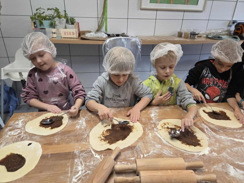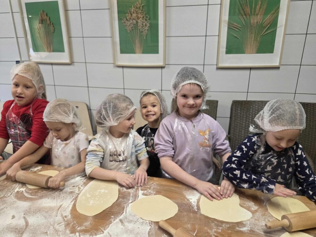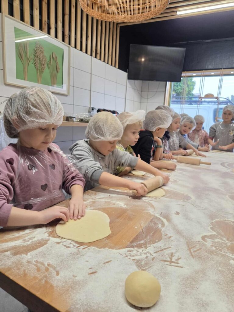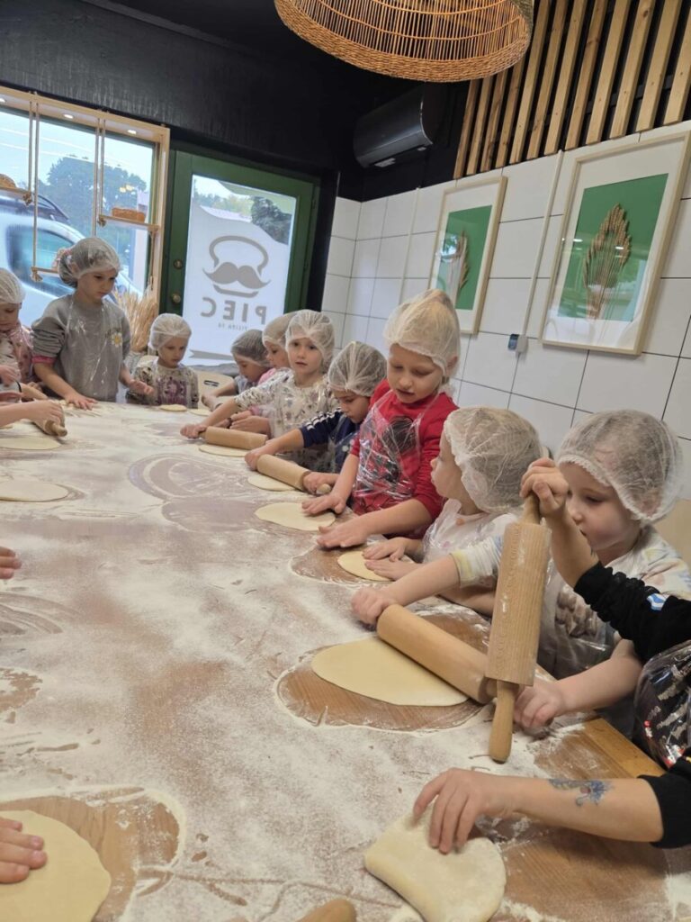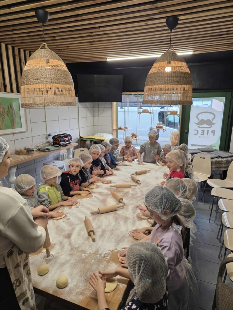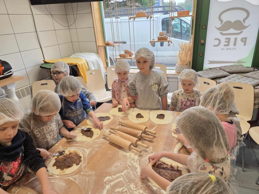 Przedszkolaki często odwiedzają różnorodne miejsca w pobliskiej okolicy. W październiku udały się na warsztaty piekarskich w piekarni Piec. Na zajęciach dzieci poznały etapy postawania chleba, zwiedziły piekarnię i obserwowały pracę piekarza, a na koniec zajęć zrobiły własne drożdżówki cynamonowe.