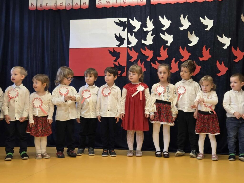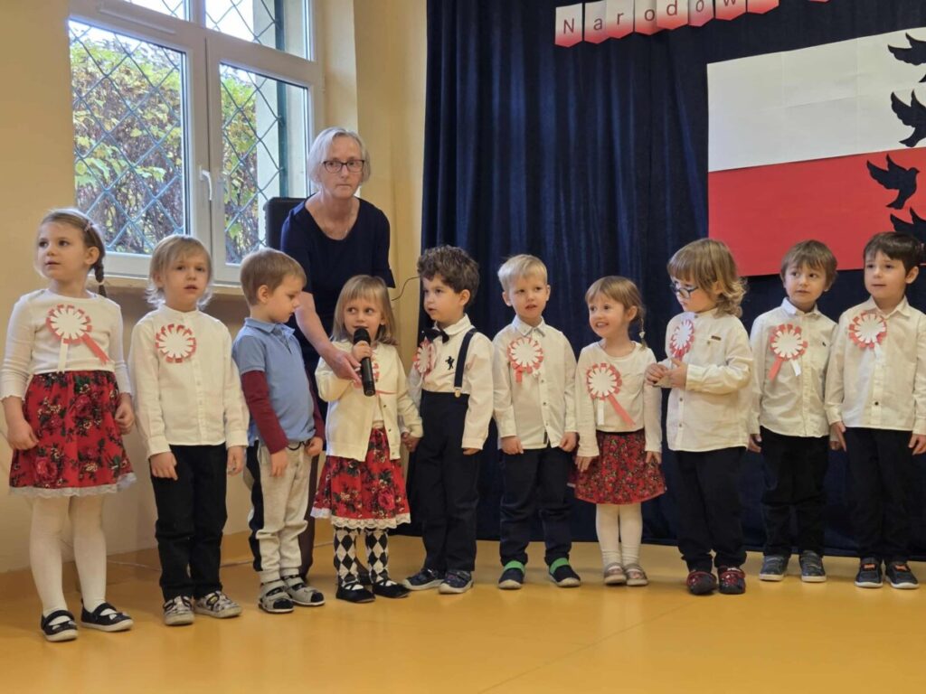 Grupa 2 przygotowała program artystyczny z okazji Narodowego Święta Niepodległości. Uroczystość przedszkolaki podkreśliły galowym strojem, wykonały też kotyliony w barwach narodowych. Społeczność przedszkola wzięła udział w akcji „Szkoła do Hymnu”. Takie spotkania są okazją do rozmowy na temat pojęcia patriotyzmu, przedszkolaki poznają narodowe symbole oraz uczą się słów Mazurka Dąbrowskiego. Udział w przedstawieniu uczy publiczność uwagi a aktorów koncentracji i współpracy. To była piękna uroczystość.