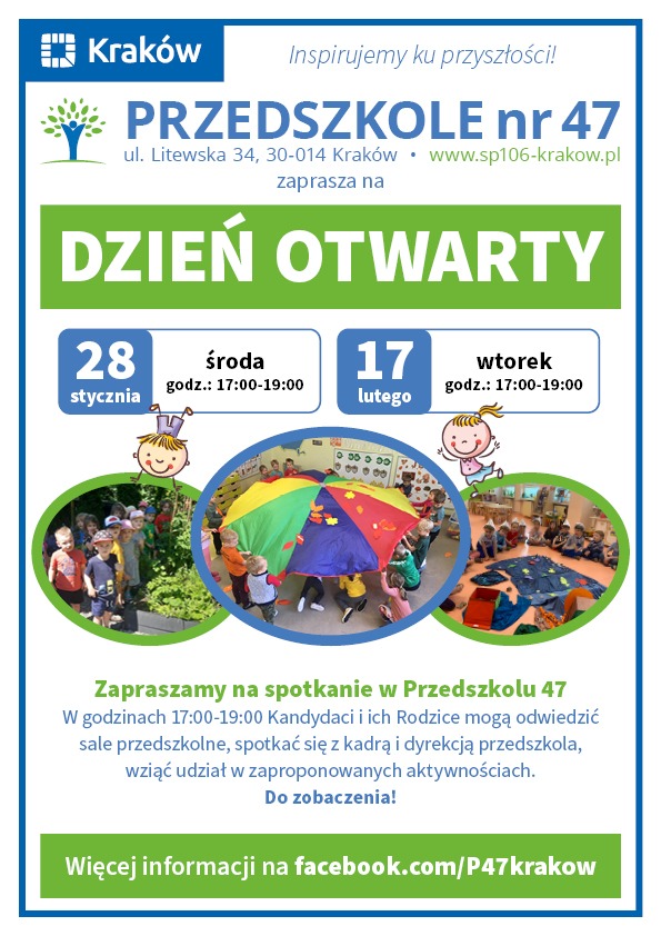 Wszystkich Rodziców, którzy chcieliby odwiedzić nasze przedszkole, zapoznać się z ofertą, procesem rekrutacji oraz poznać kadrę i dyrekcję, zapraszamy wraz z dziećmi na Dni Otwarte przedszkola. Odbędą się one 28 stycznia oraz 17 lutego w godzinach 17.00 – 19.00. Mile widziane obuwie zamienne dla Rodzica i Malucha 🙂